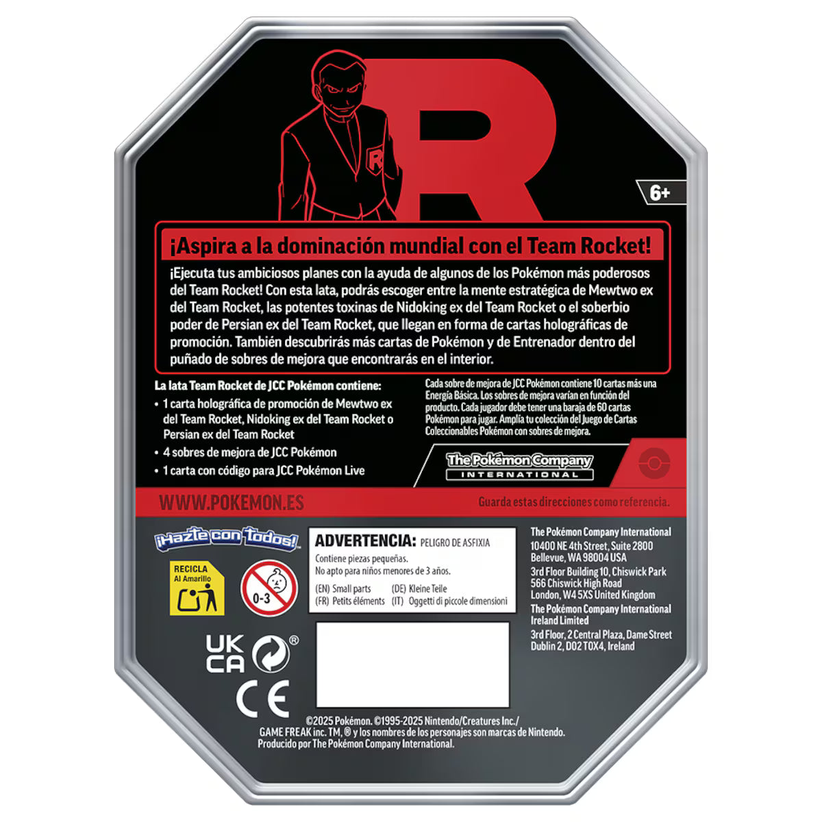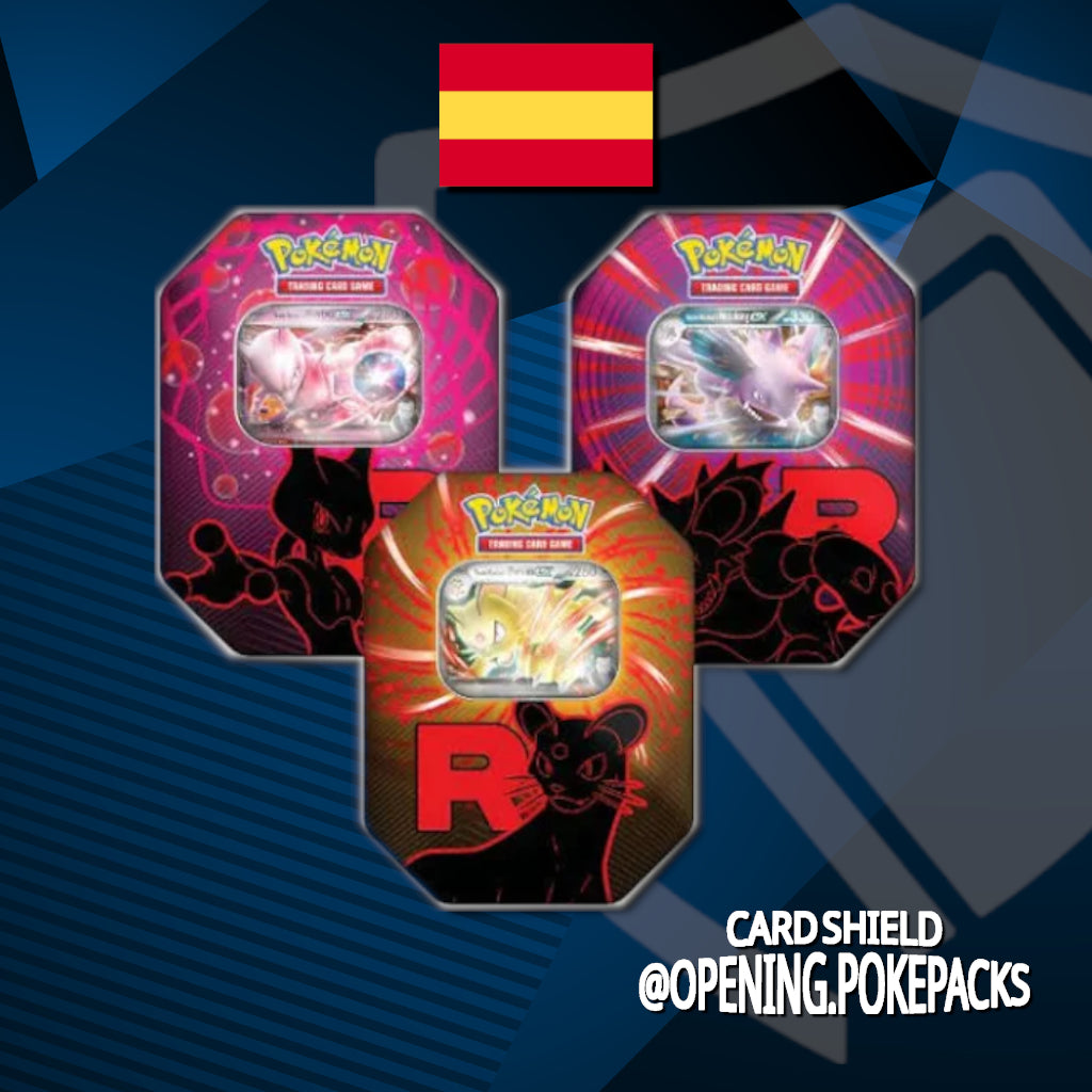 ¡Ejecuta tus ambiciones planes con la ayuda de algunos de los Pokémon más poderosos del Team Rocket! Con esta lata, podrás escoger entre la mente estratégica de Mewtwo ex del Team Rocket, las potentes toxinas de Nidoking ex del Team ROcket o el soberbio poder de Persian ex del Team Rocket, que llegan en forma de cartas holográficas de promoción. También descubrirás más cartas de Pokémon y de Entrenador dentro del puñado de sobres de mejora que encontrarás en el interior.
